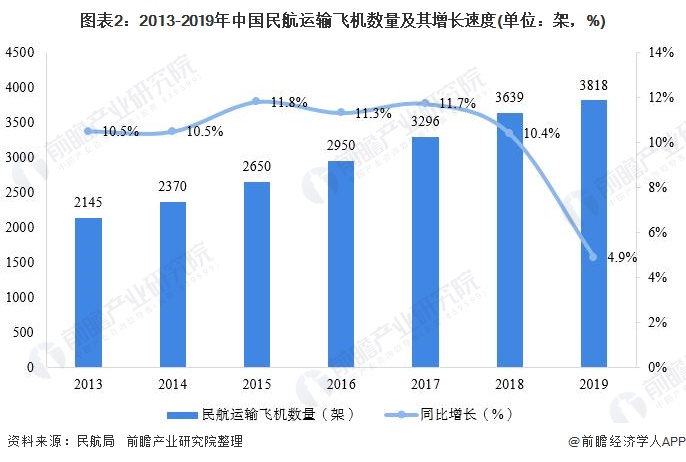 在民用航空领域,我国商用飞机规模和通用飞机规模均保持稳定增长。具体到商用飞机领域,据民航局统计数据显示,2013年以来,我国运输飞机数量持续提升,2019年,全国民航运输飞机数量为3818架,比2018年底增加179架。