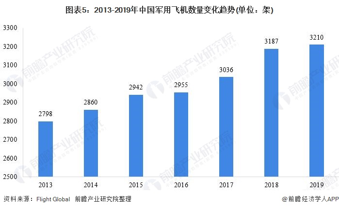 根据Flight Global发布的《World Air Force2020》报告数据显示,2013年以来,我国军用飞机数量规模持续提升,到2019年,全国军用飞机数量上升至3210架,稳居全球第三,总量少于美国(13266架)和俄罗斯(4163架)。