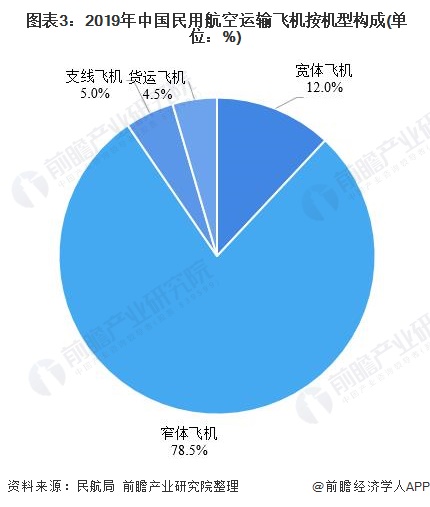 具体到飞机类型来看,截至到2019年底,我国客运飞机数量为3645架,占比为95.5%,其中宽体飞机有457架,占总量的12.0%;窄体飞机有2997架,占总量的78.5%;支线飞机有191架,占总量的5.0%。另外,货运飞机数量为173架,占总量的4.5%。
