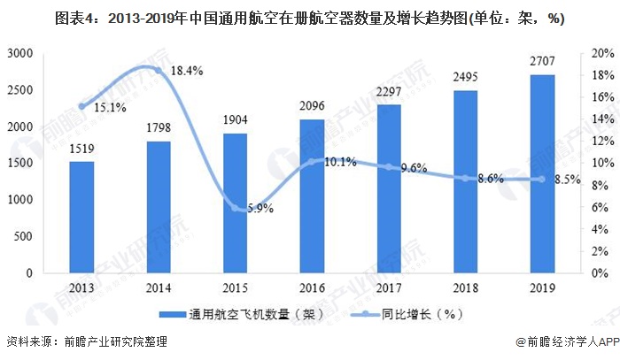 在通用飞机领域,根据国家民航总局发布的《2019年民航行业发展统计公报》,2019年底,通用航空在册航空器总数达到2707架,同比增长了8.50%。其中,教学训练用飞机849架。进入2015年后,通用航空器数量的同比增长速度有所下降,其它年份均保持在10%以上的增长速度。