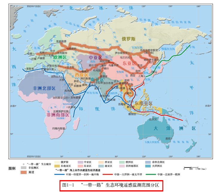 中指出“一带一路”监测区域包括亚洲、欧洲、非洲和大洋洲,并将其划分为东亚、南亚、中亚、西亚、东南亚、俄罗斯、欧洲、大洋洲、非洲北部和非洲南部,共10个地理分区。如图所示: