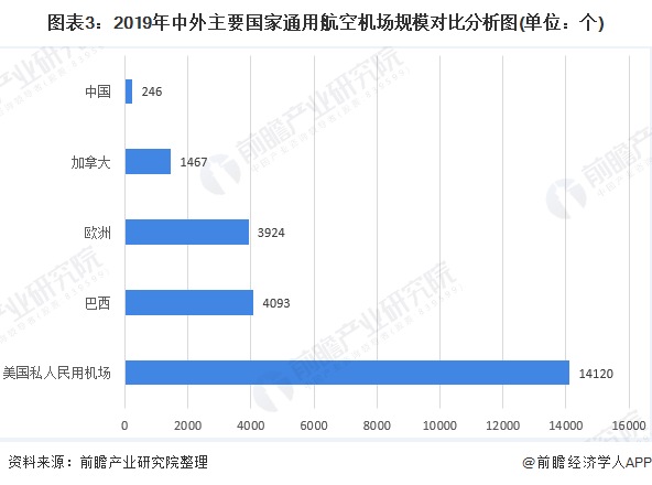 截至2019年底,中国颁证通用航空机场数量为246个;美国拥有19750个机场,其中私人民用机场数量达到14120个,包括直升机场5425个,水上机场290个,普通机场8405个等;欧洲有通用机场3924个。可见我国通用航空机场规模较其他通用航空发达国家仍有较大差距。