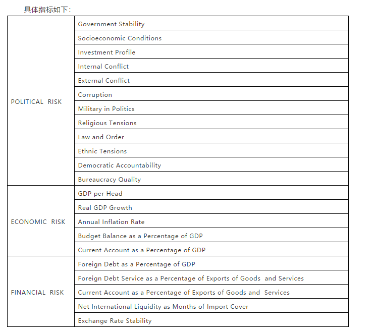 ICRG每月对140个国家进行风险评估并对26个国家进行年度风险评估。ICRG评估法对3类风险指标(政治风险、金融风险和经济风险)及其22个变量进行综合评估,使得使用者能够衡量和比较各国各种类型的风险。ICRG数据被研究国际问题的学者、机构投资者、银行、跨国公司、进口商、出口商、外汇交易商、航运公司和许多其他机构广泛使用,它可以确定金融、经济和政治风险如何影响他们现在和将来的业务和投资以及其他社会经济活动。具体指标如下: