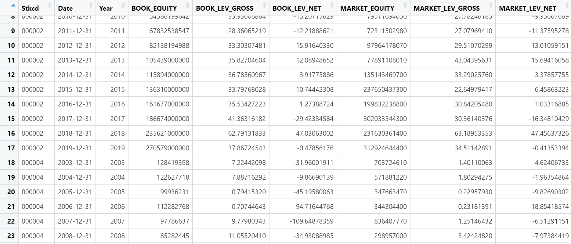 现在有1000支股票,每只股票都有6个变量且每个变量都有20年的数据,我想求每只股票6个变量两两之间的相关性应该怎么做呀,数据结构如下图所示