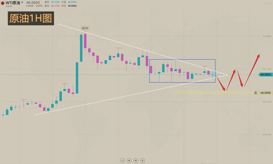原油当前属于震荡上行的走势,我此前的策略观点非常明确,回踩就是做多,45位置提示做多,原油再次新高,今日原油回踩46.6位置依然多。