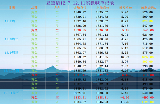 上周五黄金亚偶盘震荡走低,亚盘黛清通知学员1837进场空单,在1832位置手动止盈出局。1839通知学员进场空单,在1832位置手动止盈出局。欧盘通知学员1833进场多单,在1838位置止盈出局。1833位置通知学员进场空单,此单手动止损出局。1834通知学员进场多单,在1845位置手动止盈出局。