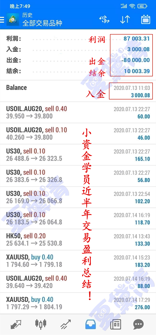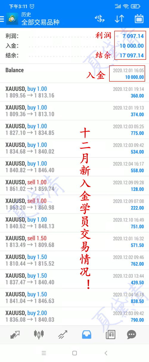 没有人可以做到单单不亏,做投资就是通过技术面分析得出进出场点位,同时用淡定的心态。能力不是嘴说,精准的点位,透彻的分析,用行情的结果证明实力。这是来自长沙的乐姐,该学员于12月1日加入实盘,共入金1万美金,9个交易日,交易13次,盈利达到七千余美金。