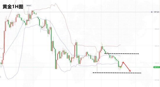 随着行情K线的运行,4小时收出三连阴,跌破均线支撑,行情再度由横转空。小时线级别,均线空头排列压制,K线跌破箱体震荡下边,突破下跌,走出此前的横盘震荡走势。布林线开口持续打开放大,30分钟级别同步协调共振。早盘跌破1835之后,空头力量增强。尽管美盘前金价有所反弹,但是并未上破1835一线强阻力区间。