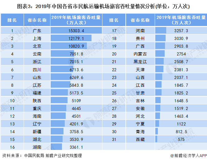 从各省市的民航运输机场旅客吞吐量情况来看,2019年我国民航运输机场旅客吞吐量主要集中在北上广地区,且均超过1亿人次;其中以广东省为首,其2019年完成机场旅客吞吐量15303.4万人次,其次是上海市完成机场旅客吞吐量12179.1万人次,北京市完成机场旅客吞吐量10820.9万人次