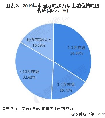 全国港口万吨级及以上泊位中,沿海港口万吨级及以上泊位2076个,增加69个;内河港口万吨级及以上泊位444个,增加7个。按照泊位吨级来划分,我国1-3万吨级和5-10万吨级泊位是主要组成部分。截至2019年底,全国港口1-3万吨级泊位数量为859个,占总量的34.09%;3-5万吨级泊位数量为421个,占总量的16.71%;5-10万吨级泊位数量为822个,占总量的32.62%;10万吨级及以上泊位数量为418个,占总量的16.59%。