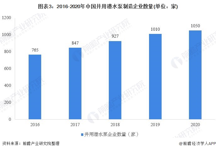 近年来,我国井用潜水泵市场规模不断增长,井用潜水泵产业加快发展,全国井用潜水泵行业企业数量逐年增长,前瞻通过企查猫查询全国井用潜水泵制造企业数量,截至2020年11月底,全国井用潜水泵制造企业共1050家,较2019年增加40家。
