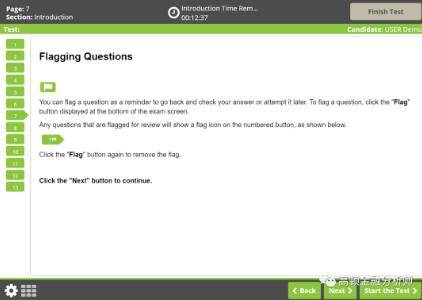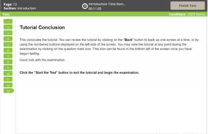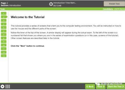 本考试教程可以跳回之前的页面重新浏览,点击“Start the test”可以开始考试,在考试过程中点击info(问号图标)可以重新查看考试教程。
