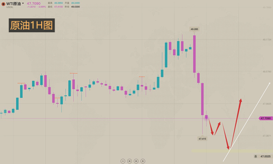 原油此前黛清的强调是,趋势上涨走势,回落就是做多,但是还有一种情况,就是原油见顶的可能就是出现跳空缺口,而最常见的是出现向上跳空后快速回落,那么大概率是见顶了。但是今日的跳空是向下的,这一情况我们还要观察,就是每次回落1小时200均线的支撑是否继续有效,如果有效,则多头将继续上涨,但是一旦破位,原油将会开启下跌模式或者是大级别的调整。