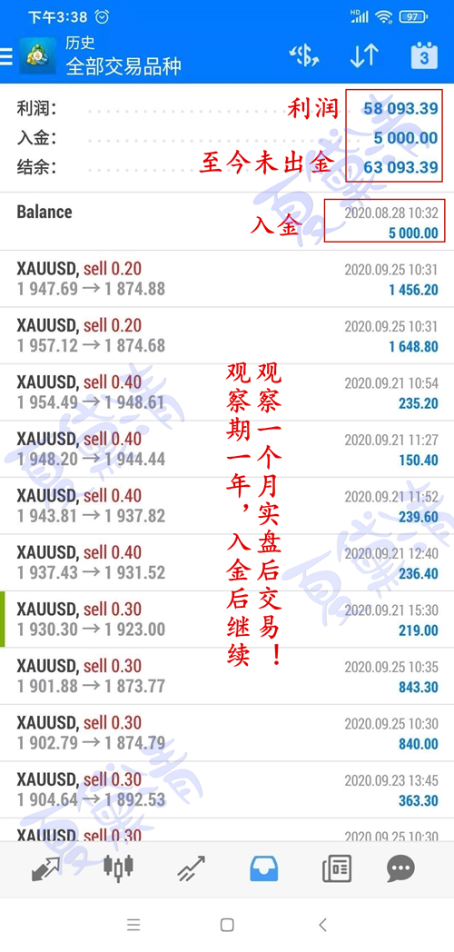 说再多不如试一试,试一试之前也要完全考察清楚。李姐2019年加的我,2020年8月份入金,9月底开始交易,我是发自内心的欣赏这位学员,因为我们中途聊过很多次,李姐不是不信任我,而是之前经历过的亏损太多了,刚加上一个老师就加入实盘,亏损之后换老师,导致自己一直在循环往复的亏损。