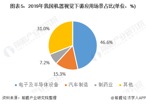 目前机器视觉现有主要的应用场景有电子设备及半导体、汽车、制药、食品包装等。电子及半导体设备占约46.60%,主要应用在高精度的制造和检测,如晶圆切割、3C表面检测、AOI光学检测、PCB印刷电路等。汽车制造是机器视觉应用的第二大场景,约占15.3%左右,几乎所有系统和部件的制造都可用到机器视觉,一条汽车生产线需十几套机器视觉系统,是机器视觉渗透最快的行业。制药业约占下游应用的7.2%,主要应用为药品质量的检测。