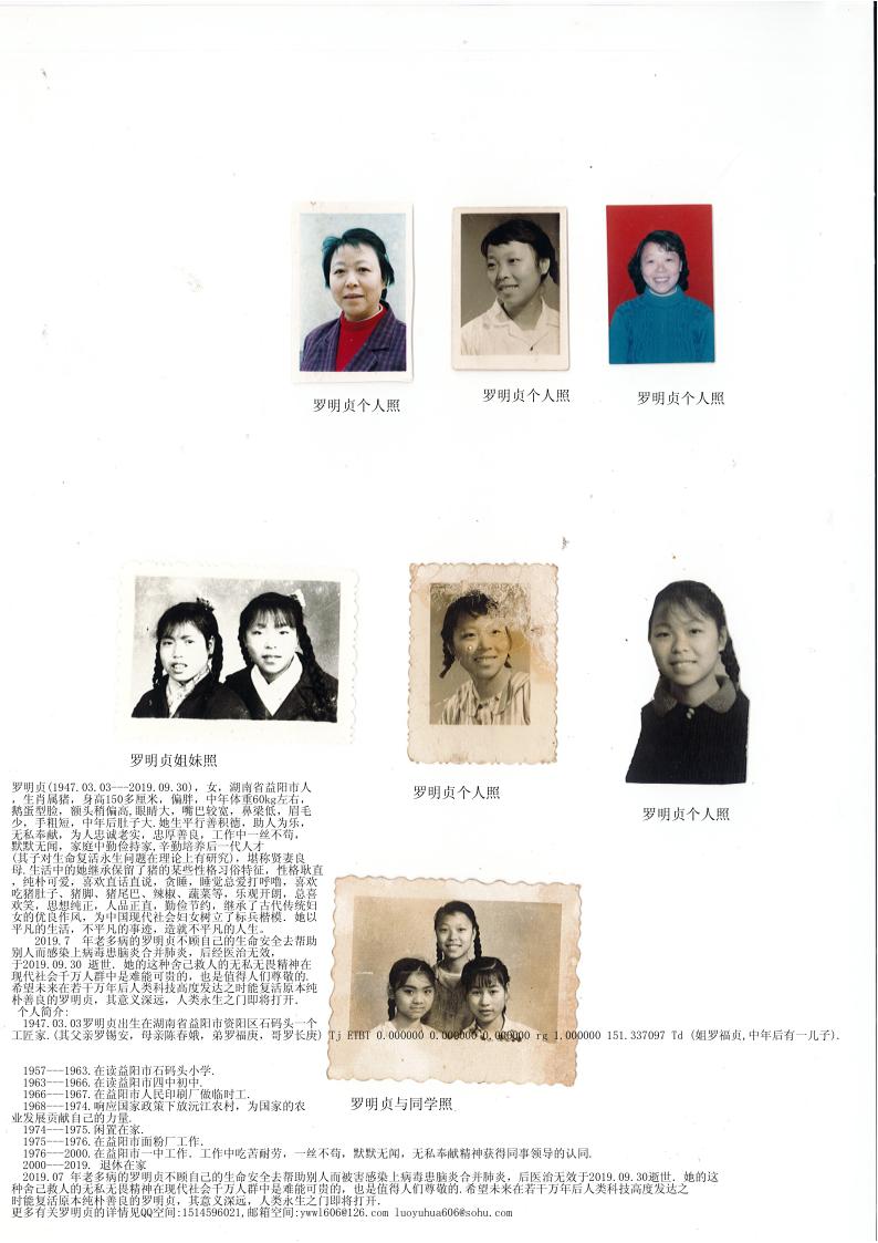 2019.7 年老多病的罗明贞不顾自己的生命安全去帮助别人而反被坏人所害感染上病毒患脑炎合并肺炎,后经医治无效,于2019.09.30 逝世.她的这种舍己救人的无私无畏精神在现代社会千万人群中是难能可贵的,也是值得人们尊敬的.希望未来在若干万年后人类科技高度发达之时能复活原本纯朴善良的罗明贞,其意义深远,人类永生之门即将打开.