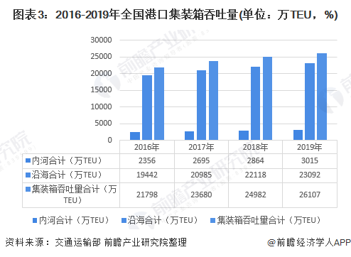 2016-2019年,中国规模以上港口集装箱吞吐量逐年上升,2019年为26107万TEU,同比增长4.5%。其中,沿海港口完成23092万TEU,增长4.4%;内河港口完成3015万TEU,增长5.26%。