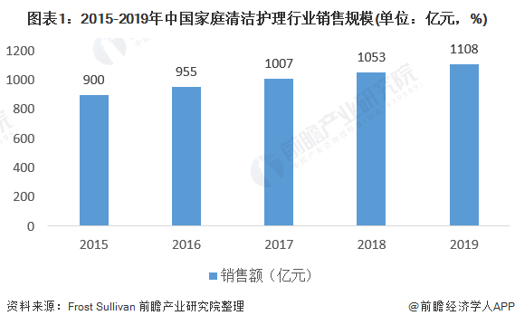 清洁洗护产品为日常生活中的常备消费品,产品价格低,消费频次高。在我国较大人口基数背景下,国内家庭清洁护理行业体量较大稳步扩张。根据Frost&Sullivan数据,中国家庭清洁护理行业的零售销售额价值从2015年的900亿元上升至2019年的1108亿元,年均复合增速为5.3%,增速高于同期全球家庭清洁护理行业2.5%的增长率。