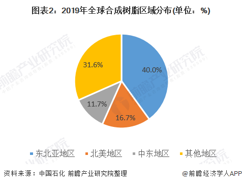 中国作为世界主要的生产基地,在包装、农业、电子电器、汽车等产业都具有重要地位,因此其合成树脂消费量在东北亚地区乃至全球的消费量相对较大。2019年,中国合成树脂消费量达到9866.5万吨,占全球消费比重约为38.7%。