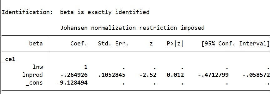 这是在stata里输入命令“vec lnw lnprod,lags(1) rank(1)”后显示的结果,我只会写协整方程