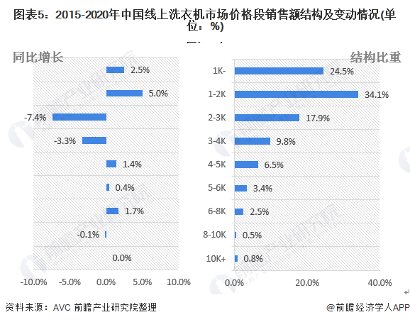 2020年上半年我国线上渠道销售的洗衣机价格主要集中在2K以下,其中1K以下比重为24.5%,1-2K之间比重为34.1%。此外,这两个价格区间段的洗衣机销售额分别同比增长了2.5%和5.0%。
