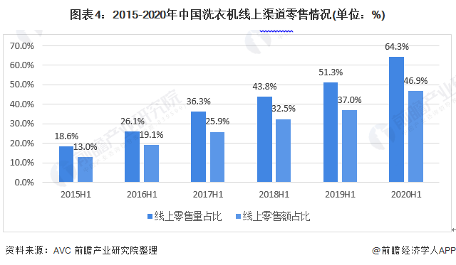 2015年H1-2020年H1期间我国洗衣机线上渠道零售量占比和线上渠道零售额占比总体呈逐年增长态势,2020年H1我国洗衣机线上渠道零售量占比为64.3%,同比上涨13%;线上渠道零售额占比为46.9%;同比上涨9.9%。