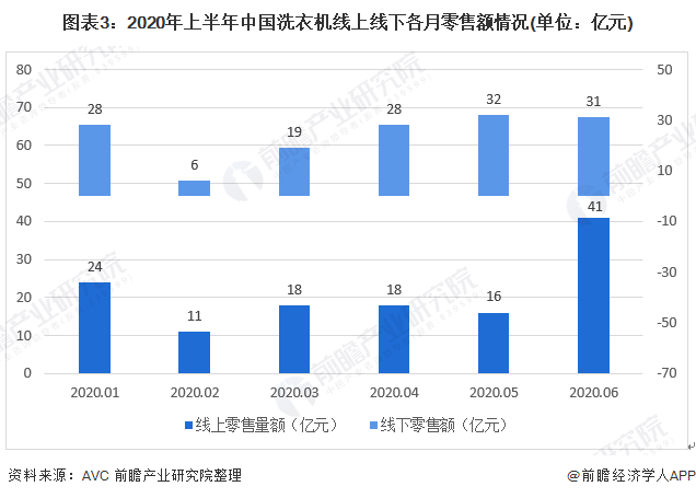 2020年1-5月我国洗衣机线下渠道略高于线上渠道,在6月线上渠道零售额为41亿元,较线下渠道零售额多10亿元,线上渠道迎来一波大幅上涨。