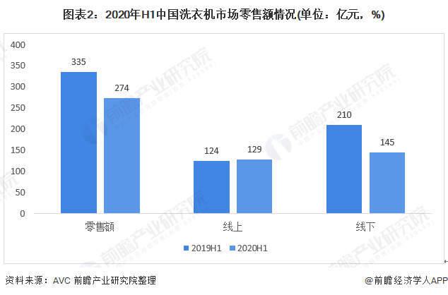 2020年上半年我国洗衣机零售额为274亿元,线上渠道零售额为129亿元