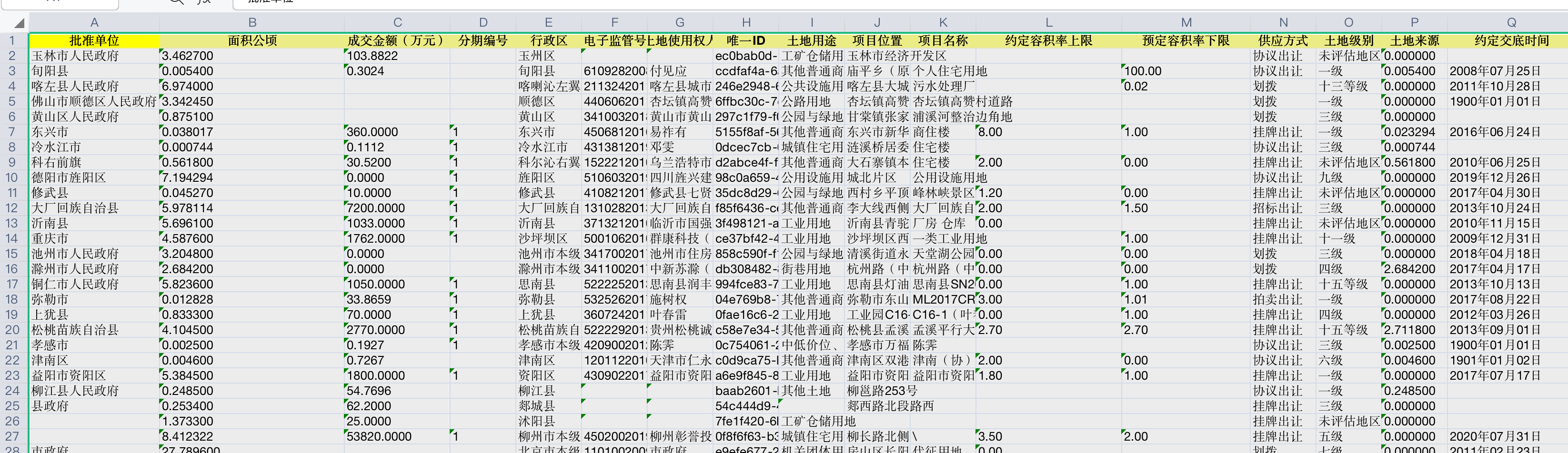 行政区,电子监管号,项目名称,项目位置,面积(公顷),土地来源,土地用途,供地方式,土地使用年限,行业分类,土地级别,成交价格(万元),土地使用权人,约定容积率上限,约定容积率下限,约定交地时间,约定开工时间,约定竣工时间,实际开工时间,实际竣工时间,批准单位,合同签订日期,需要做学术研究的老师跟同学联系 Q 455776212