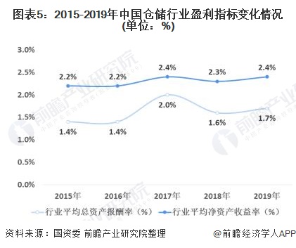根据国资委公布数据显示,2015-2019年中国仓储行业平均总资产报酬率及平均净资产收益率维持在1%-3%的较低水平,说明仓储行业的资产利用效益较低,行业平均盈利水平较低。