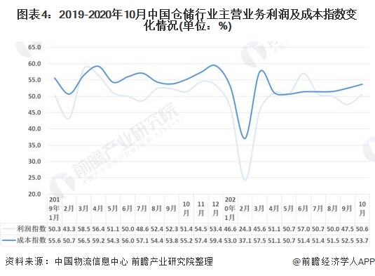 2020年初受到疫情影响,中国仓储业务利润指数在2020年2月份降到历史最低的24.3%,之后迅速回升,2020年10月份为50.6%,与2019年同期相比均有不同程度的降幅;而仓储业务成本指数从三月份开始处于行业枯荣线以上水平,反映出企业运营成本仍在不断上升,到2020年10月企业主营业务成本指数为53.7%,达到七个月以来高点。
