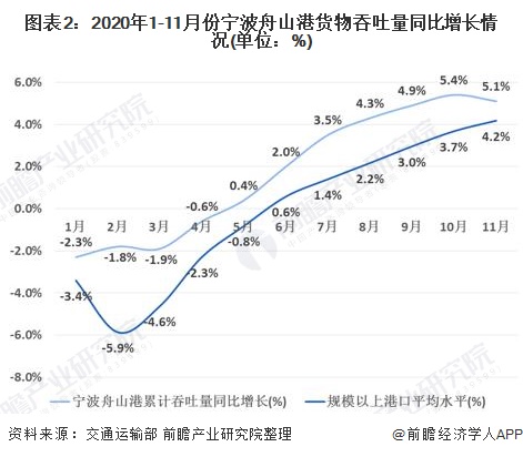 从宁波舟山港在2020年全年的吞吐总量走势情况来看,1-4月份的累计吞吐量处于负增长状态,从5月份开始恢复至2019年同期水平以上,此后持续保持正增长状态,并且1-11月份整体累计增长水平高于行业平均水平,反映出宁波舟山港发展势头相对较好。