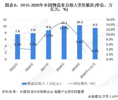 从物流业总收入来看,2015-2019年国内物流行业总收入逐年增长,到2019年达到10.3万亿元,同比增长9.0%。2020年1-11月份,物流业总收入为9.5万亿元,同比增长1.9%。反映出行业整体经营状态良好。