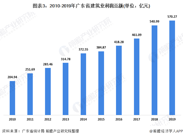 2019年,广东省全社会建筑业增加值4255.07亿元,比上年增长5.9%;实现利税总额1094.41亿元,同比增长10.0%;利润总额570.27亿元,同比增长5.9%。