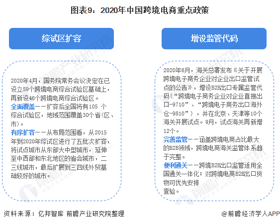 2020年6月,海关总署发布《关于开展跨境电子商务企业对企业出口监管试点的公告》,增设“跨境电子商务企业对企业直接出口-9710”、“跨境电子商务出口海外仓-9810”代码。在疫情影响之下,发展跨境电商是做好“六稳”工作、落实“六保”任务的重要举措。2020年上半年,利好政策连续出台,点明了国家对跨境电商的一贯支持态度。