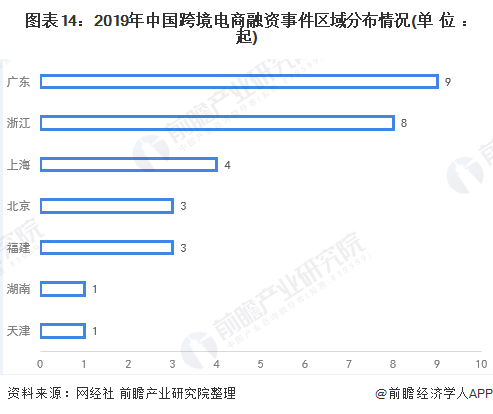 据网经社对2019年我国跨境电商行业投融资事件统计分析,2019年我国跨境电商融资事件29起。从区域分布上来看,绝大多数投融资活动发生在沿海地区,广东和浙江最为活跃,分别为9起和8起,成为投融资热门地区;上海、福建、北京分别为4起、3起、3起;天津和湖南各1起。