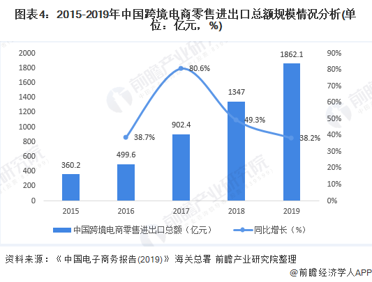 此外,根据海关总署数据,2015-2019年我国跨境电商零售进出口总额呈现逐年增长态势。其中2019年全国新增跨境电商企业超6000家,跨境电商零售进出口总额达1862.1亿元,同比增长38.2%。