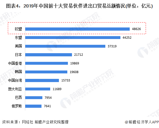 随着国内制造业和电商的发展,跨境物流企业逐步完成了海外自动化仓储中心的布局、覆盖全球的高效服务网络搭建和国际智能物流管理体系建设。中国物流企业将逐渐构建在海外的智能化、集约化的国际竞争优势,这个方向上的企业有着巨大的投资空间。在未来跨境物流行业的潜力市场方面,根据2019年中国前十大贸易伙伴进出口贸易总额来看,我国对欧盟国家的进出口贸易总额达4.86万亿元,贸易总额排名首位。