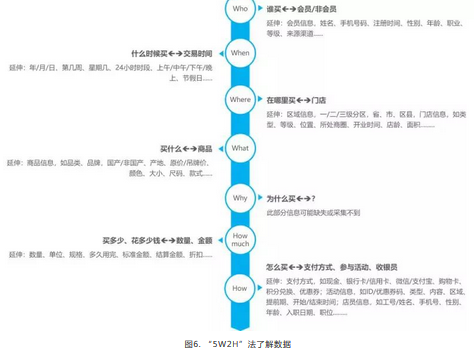 反过来,我们也可从数据中获取这些信息,还原出真实业务场景。从事实表数据的字段信息中,可以知道会员/非会员(谁买)、订单时间(什么时候买)、门店(在哪里买)、购买的商品(买什么)、数量(买多少)、花多少钱(金额)、折扣优惠(有无打折)、支付方式(怎么付款)、收银员,等等。每个方面的信息又可结合维度表,或者融合外部数据,延伸得到更多维度的信息。例如,知道什么人买,可进一步知道这个人的基本信息,如性别、年龄、职业、注册时间等;在哪个门店购买,可进一步知道省、市、区县以及商圈的信息,还可知道门店是什么类型(如街边店、商场店);买了什么商品,结合商品表,或关联外部数据,可知道商品的具体属性信息。