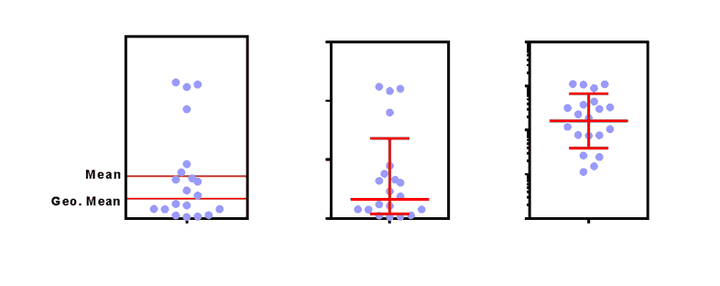 上图绘制从对数正态分布中抽样的20个值。左侧图表表明平均值和几何均值非常不同。中间图表绘制了几何均值,将误差条计算为几何均值乘以或除以几何SD因子。该图表使用对数Y轴显示同样的情况。现在分布看起来对称,误差条似乎在每个方向延伸相同距离。但在中间和右侧图中,误差条末端是相同的Y值。右图使用对数轴。