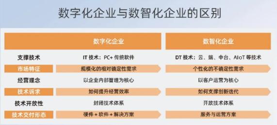 “数字化企业”正加速向“数智化企业”演进,其本质区别不仅仅表现在支撑技术体系的差异性,而且体现在数智化企业面临的市场特征、经营理念、技术诉求、技术开放性、技术交付形态的差异性。