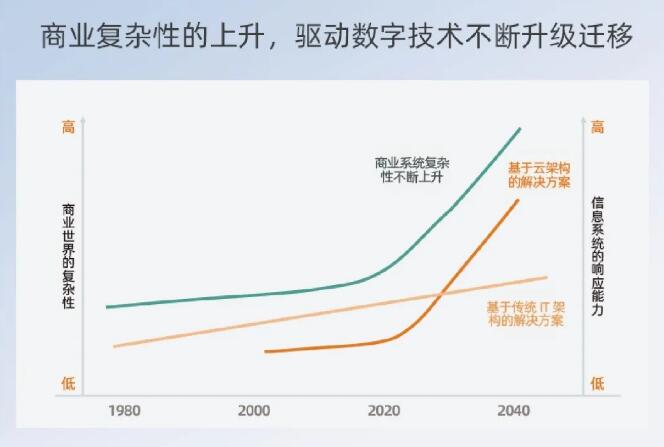 业务和管理复杂性的上升,最终带来的结果,就是倒逼和推动了传统IT技术架构向云架构的迁移。这一进程从本世纪初开始已有十年以上,在未来十年还将全面加速。随着亚马逊、谷歌、阿里巴巴、脸谱等巨型生态系统的出现,这一进程又得到了进一步加速。2009年,阿里巴巴开始“去IOE”,到2013年,最后一台小型机下线。2019年10月,亚马逊消费者业务关闭最终的甲骨文数据库,将存储在近7500个甲骨文数据库中的75PB的数据完成了迁移,包括复杂的采购、目录管理、订单履行、会计和视频流。这使得亚马逊的数据库成本降低60%以上,面向消费者的应用程序延迟将减少40%,切换到托管服务的数据库管理开销将减少70%。
