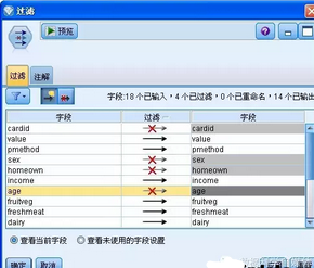 第三步,为流添加 过滤节点,将不参与的字段排除在外。该步骤为可选步骤。从“字段选项”卡中选择“过滤”节点,并将其拖入到界面中,将“过滤”节点加入到流中。双击打开“过滤”节点,在不参与建模字段的箭头上点击,会出现一个红叉,表示该字段被过滤掉了,不参与建模,如图所示。