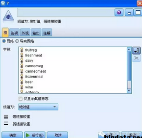 第四步,有了这些前期的准备过程,接下来就可以开始创建关联规则模型节点了,在此之前,让我们先添加一个图形节点—— 网络节点,建立此节点的目的是为了让用户首先可以直观的看到商品之间的关联程度,有一个感性认识。选择“图形”选项卡中的“网络”节点,将此拖入界面,将“网络”节点加入流中,与“过滤”节点连接起来。双击打开网络节点,在“字段”列表中选择添加字段,可以将所有的商品字段添加进来;也可以点击“仅显示真值标志”,将只显示那些“两者”的字段,如图所示。