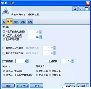点击“运行”按钮,这时会生成一个商品之间关联程度(链接数量)的网络图,用户可以在下方的调节杆上调节链接数量的显示范围。
