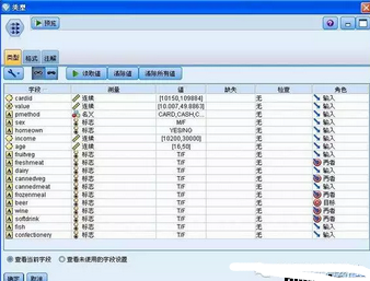 接着可以为参与建模的数据字段设置角色,角色分“输入”,“目标”,“两者”和“无”。输入表示该字段可供建模使用,目标表示该字段为建模的预测目标,两者表示该字段为布尔型的输入字段,无表示该字段不参与建模。Apriori 节点需要一个或多个输入字段和一个或多个目标字段,输入字段和输出字段必须是符号型字段。在此可以选择一个或多个字段为目标字段,表明该模型的预测目标字段;对于 Apriori 建模节点,也可以不设置目标字段,则需要在建模节点中设置“后项”。