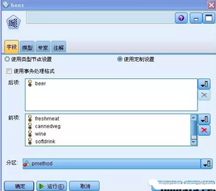 该“字段”选项卡,是设置参与建模的字段和目标字段的,可以看到其中包括两个选项,“使用类型节点设置”和“使用定制设置”,这里将为用户分别呈现两种选项的使用方法。这里无论选择哪个选项,都需要将市场分析员重点关注的商品包括在其中,其他商品可以不包括。