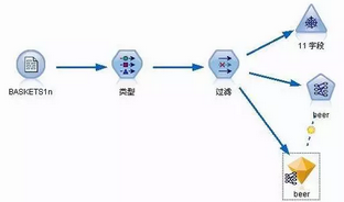 此时,我们已经创建好了关联规则模型的整个流,点击工具栏的绿色箭头,运行该流,会生成一个“模型”节点,该节点里包含了模型运行结果。整个运行后的流图,如下图所示。