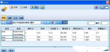 从结果可以看出,通过关联规则模型挖掘出了三个规则,分别是规则一,购买了冻肉(frozenmeal)和罐装蔬菜(cannedveg)的顾客都会购买啤酒(beer);规则二,购买了冻肉的顾客都会购买啤酒;规则三,购买了罐装蔬菜的顾客都会购买啤酒。其中,第一列代表结果,而下一列代表条件,后面的列包含规则信息,如置信度、支持度和提升等。