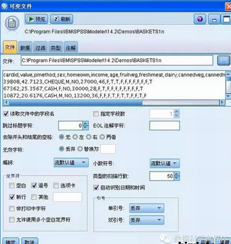 第一步,为流添加一个数据节点,这里选择 Modeler 自带的 Demo 数据。将界面下方选项卡的“源”选项中的“可变文件”拖放到空白界面中,双击打开,在文件选项卡中选择 Modeler 自带的 Demo 数据 BASKETS1n,如图所示。